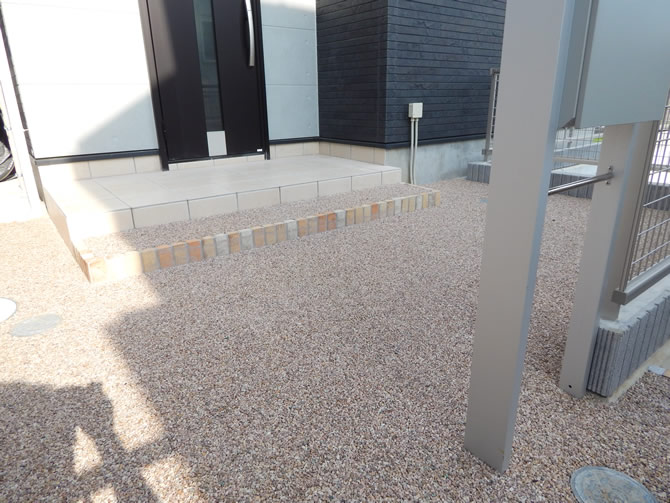 愛着のあるピンクのフロアビーズを玄関ポーチ一面に敷き詰めました。アクセントを利かす為、立ち上がりはレンガの見切りでアクセント。機能門柱はモダンスタイルを仕様に。