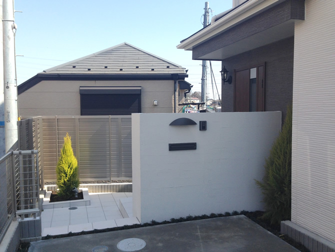 北側の玄関を明るくするために、袖壁と玄関アプローチを明るいホワイトで統一しました。玄関アプローチはモダンスタイルのタイル敷きに。ワンポイントの植栽はスポットライトを設置して夜でも明るく、植栽を照らします。