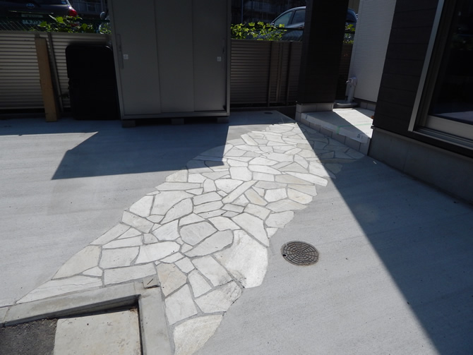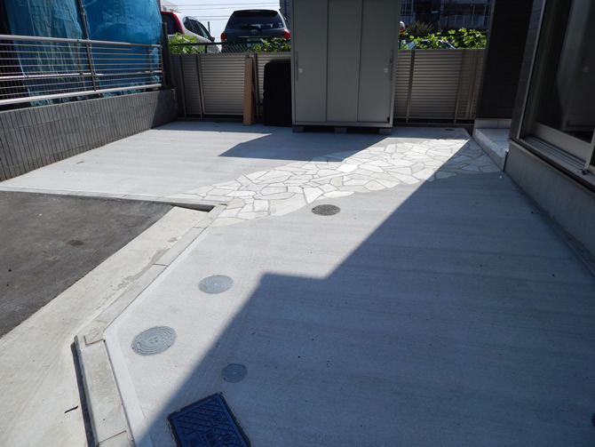 シンプルな土間打ちのカースペースにワンポイントのアクセントをつける為、中央にエルドラドクウォーツを施工しました。