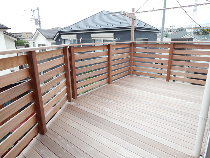 2階のバルコニー箇所をウッドテラスに施工しました。横浜大桟橋や海ほたるでも使用されている、高耐久性の天然木イペ材を仕様しています。