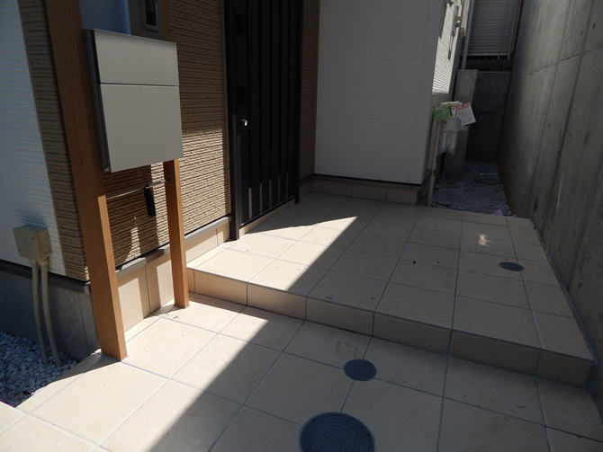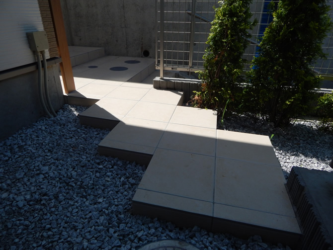 タイル張りの玄関アプローチ脇の空間に、幾何学的なタイル張りを施工しました。明るさを演出する為、ホワイトの砂利を使用。フェンス前には目隠し効果の植栽を植えています。