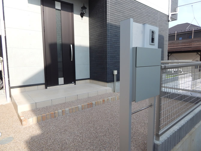愛着のあるピンクのフロアビーズを玄関ポーチ一面に敷き詰めました。アクセントを利かす為、立ち上がりはレンガの見切りでアクセント。機能門柱はモダンスタイルを仕様に。