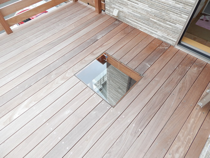 2階のバルコニー箇所をウッドテラスに施工しました。横浜大桟橋や海ほたるでも使用されている、高耐久性の天然木イペ材を仕様しています。