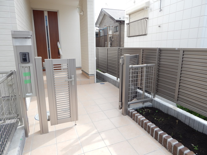 【仕様】アプローチ:タイル張り(パティーナ300パイ)機能門柱:スクリーンファンクションユニット 門扉:プリレオR2型 他